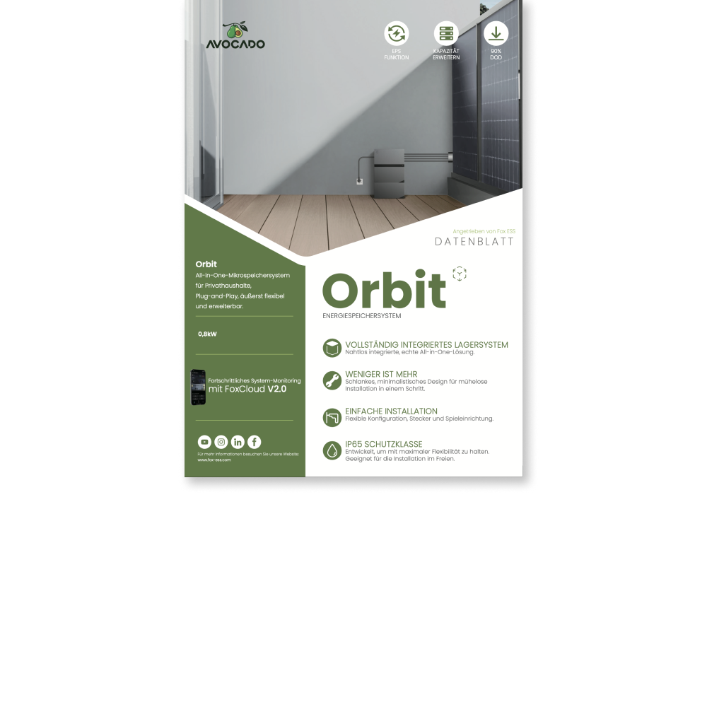 Solarstrom speichern und nutzen, wann Du willst – mit dem Avocado Orbit M wird’s möglich! Der innovative Balkonkraftwerk-Speicher, gemeinsam entwickelt von priwatt und FOX ESS, bietet Dir modernste Speichertechnologie zum Bestpreis. Für einen geringen Anschaffungspreis sicherst Du Dir ein echtes Kraftpaket – 100 % kompatibel mit allen priwatt-Systemen.