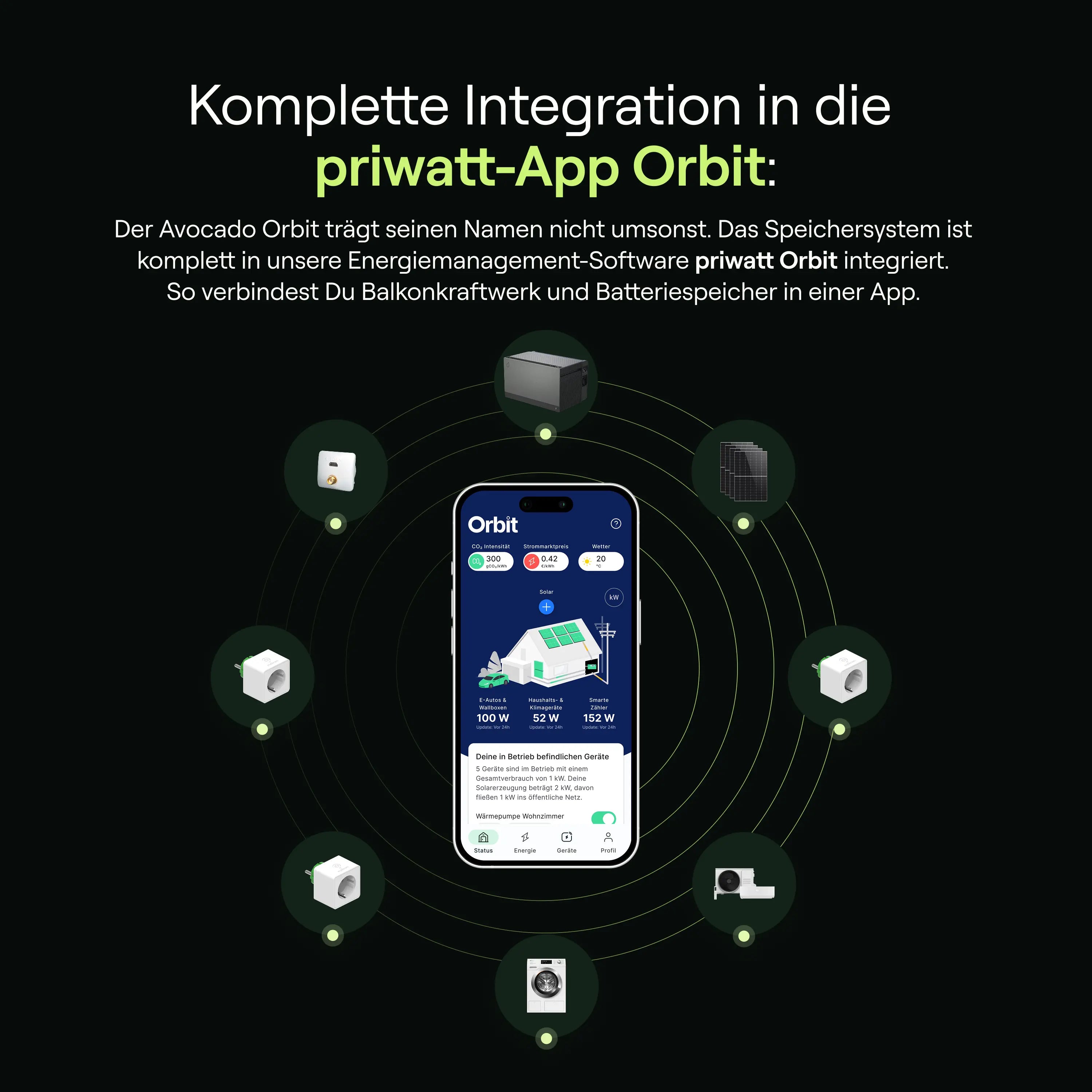 Der Avocado Orbit M ist vollständig kompatibel mit dem Orbit-Energiemanager, der Dir eine Echtzeit-Überwachung ermöglicht. Du kannst Deine Energieverbrauchsmuster analysieren und Dein System so steuern, dass Du jederzeit den maximalen Nutzen aus Deinem Solarstrom ziehst. Der Energiemanager hilft Dir zudem, Deine Eigenverbrauchsquote zu erhöhen und Deinen Stromverbrauch effizient zu gestalten.