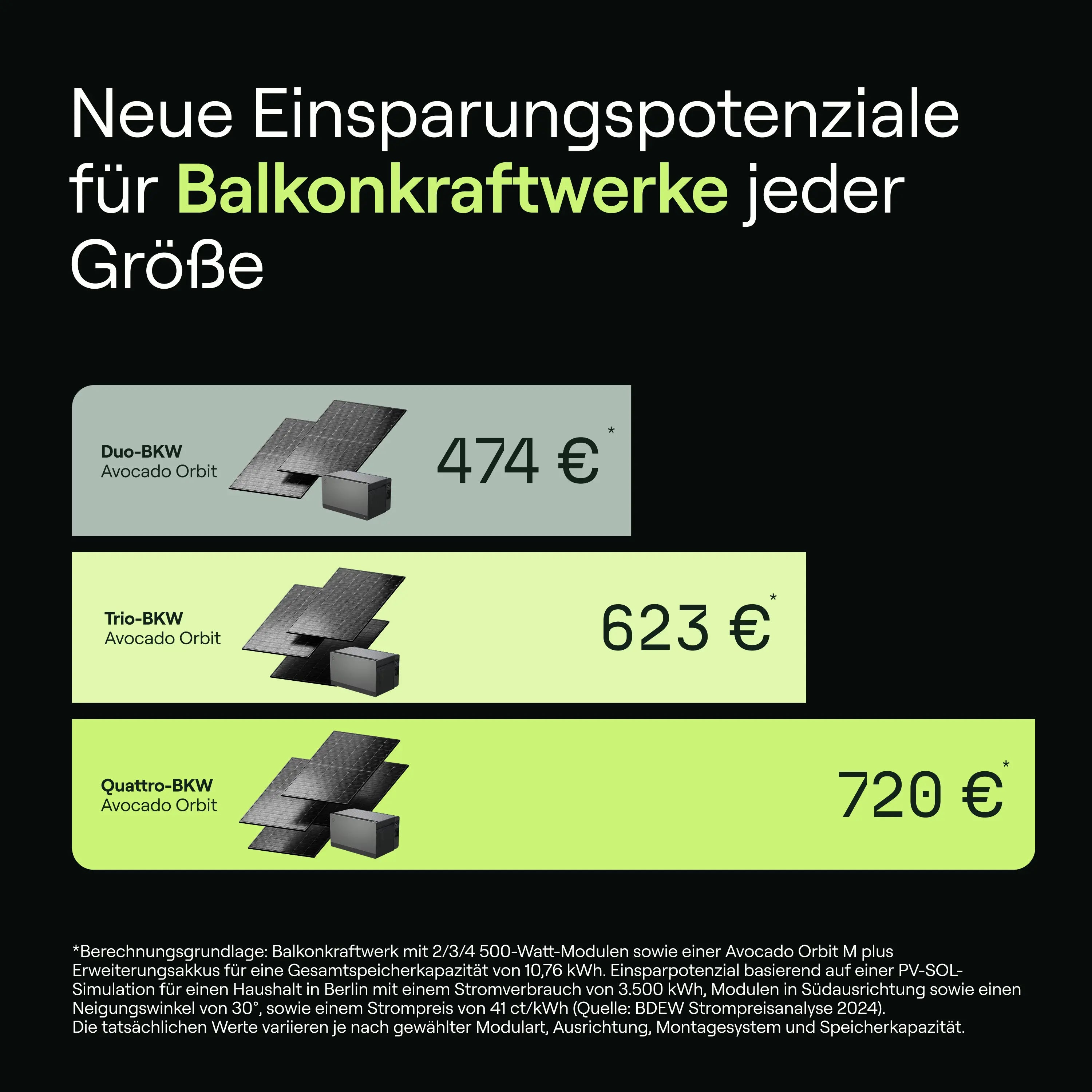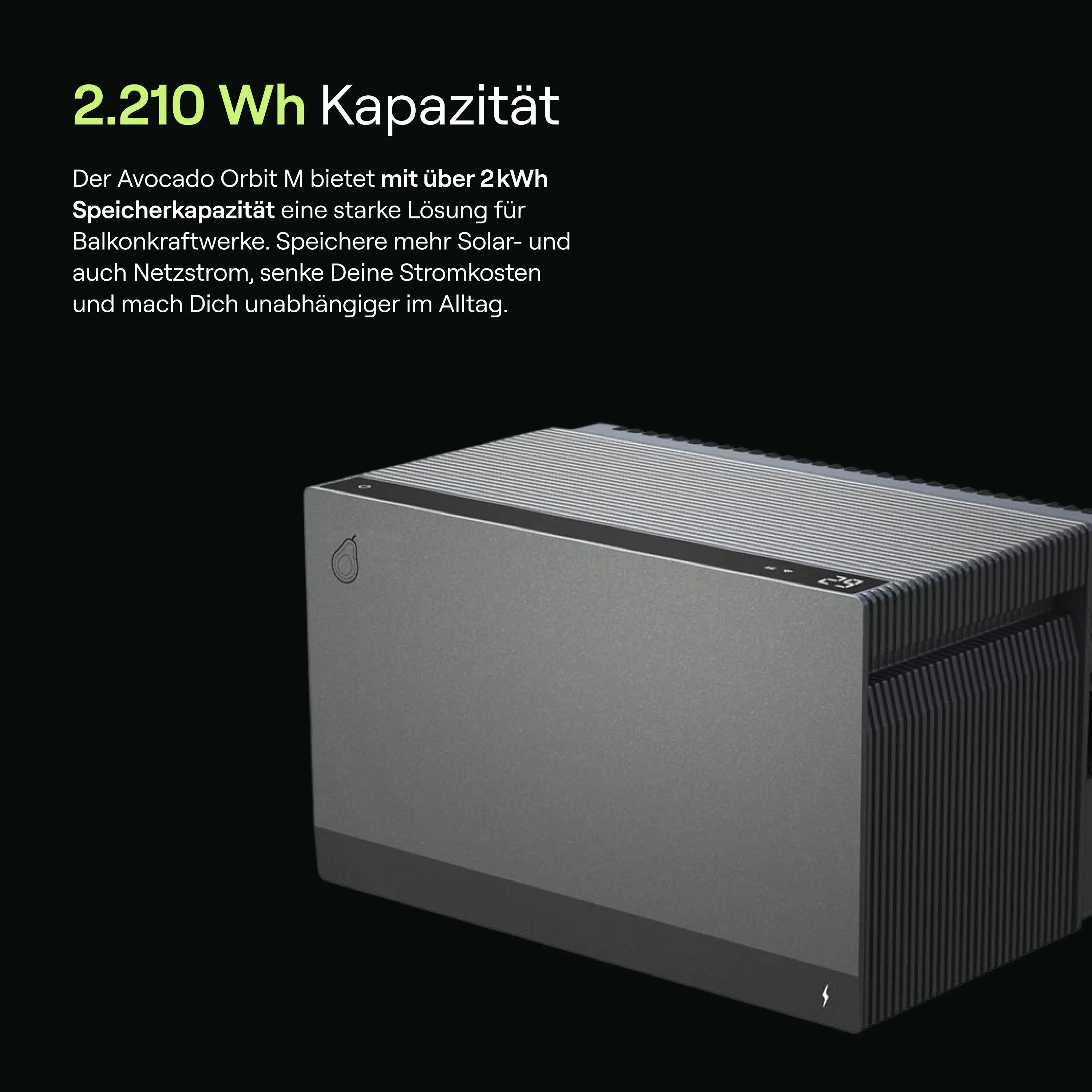 Der Avocado Orbit M kommt mit einer Basiskapazität von 2,1 kWh, die für den täglichen Bedarf einer typischen Wohnung für den Anfang ausreicht. Bei steigendem Stromverbrauch kannst Du die Kapazität flexibel erweitern. Mit bis zu 10,55 kWh (durch Erweiterungsbatterien Avocado Orbit S) ist der Speicher auch für größere Haushalte oder einen intensiveren Eigenverbrauch perfekt geeignet.