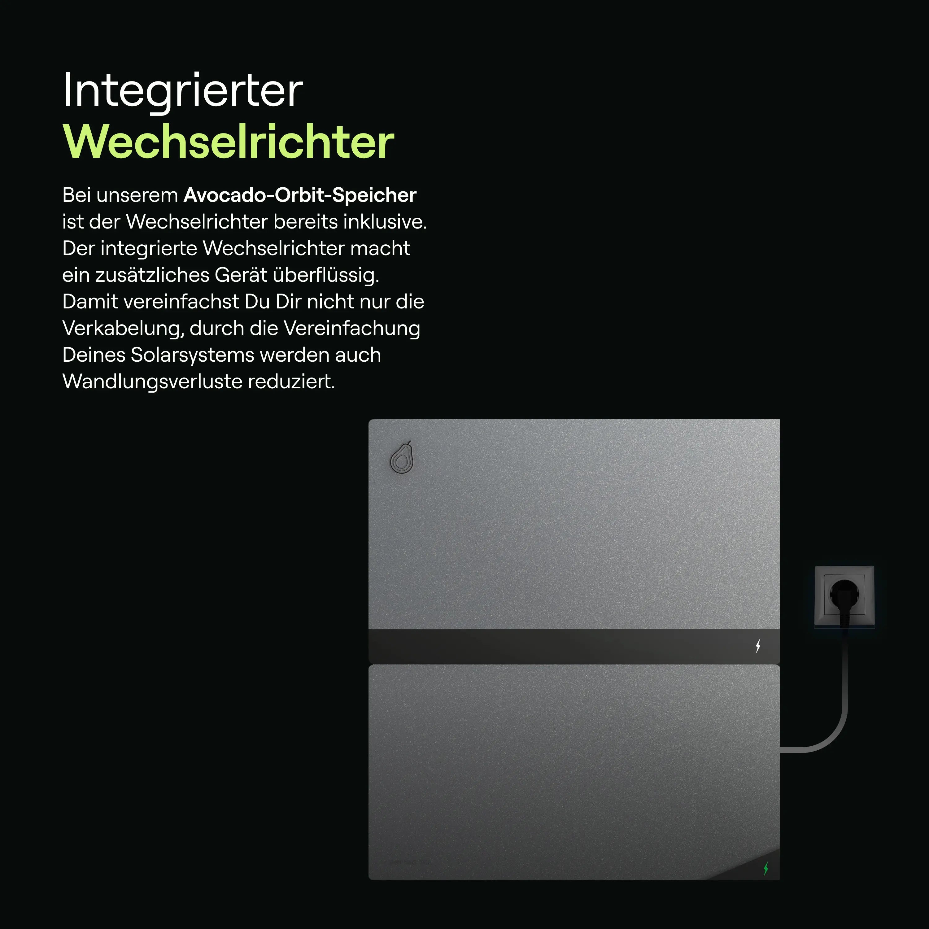 Der Avocado Orbit M verfügt über einen integrierten bidirektionalen 800-W-Wechselrichter. Dieser Wechselrichter wandelt den erzeugten Gleichstrom (DC) aus Deinen Solarmodulen effizient in Wechselstrom (AC) für den Haushalt um und speist gleichzeitig überschüssigen Strom ins Netz ein. Der bidirektionale Wechselrichter ermöglicht zudem eine effektive Nutzung des Stroms aus dem Speicher.